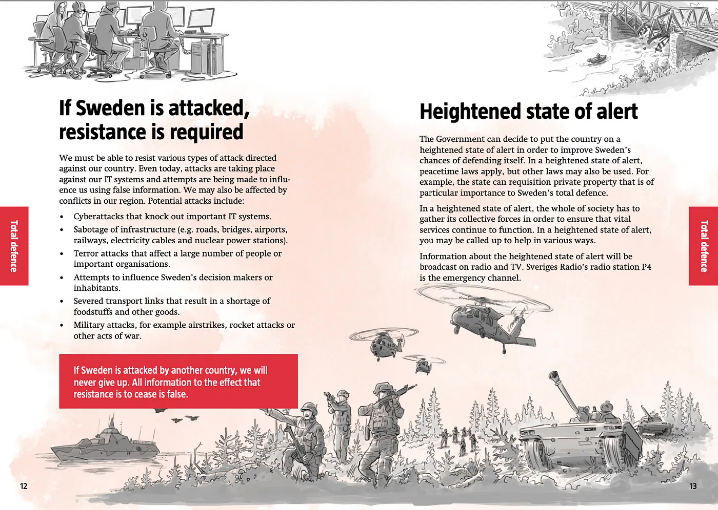 The modern Swedish version is more useful, and an impressive document for its clarity and focus. The brochure is focussed more broadly on crises such as climate related incidents, terrorism, and disinformation, as well as acts of war.