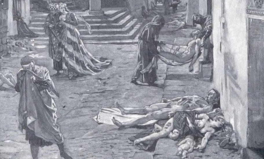 So zooming out, we humans have a habit of going into phases of mass destruction, generally self imposed to some extent or another. This handy list shows all the wars over time. Wars are actually the norm for humans, but every now and then something big comes along. I am interested in the Black Death, which devastated Europe. The opening of Boccaccio’s Decameron describes Florence in the grips of the Plague. It is as beyond imagination as the Somme, Hiroshima, or the Holocaust. I mean, you quite literally can’t put yourself there and imagine what it was like. For those in the midst of the Plague it must have felt like the end of the world.