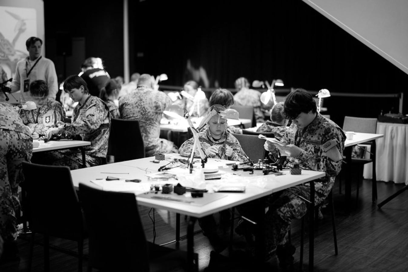 The Prime Minister of Latvia can be seen strolling through the expo stands talking to the startups about their products. Decorated military personnel are milling about and chatting to CEOs of major corporations, academics take the stage, and even kids in volunteer youth guard uniforms cluster around the tables of the drone building workshop, hosted by the Drone Aid Collective, European Defence Tech Hub, and and Riga Technical University.