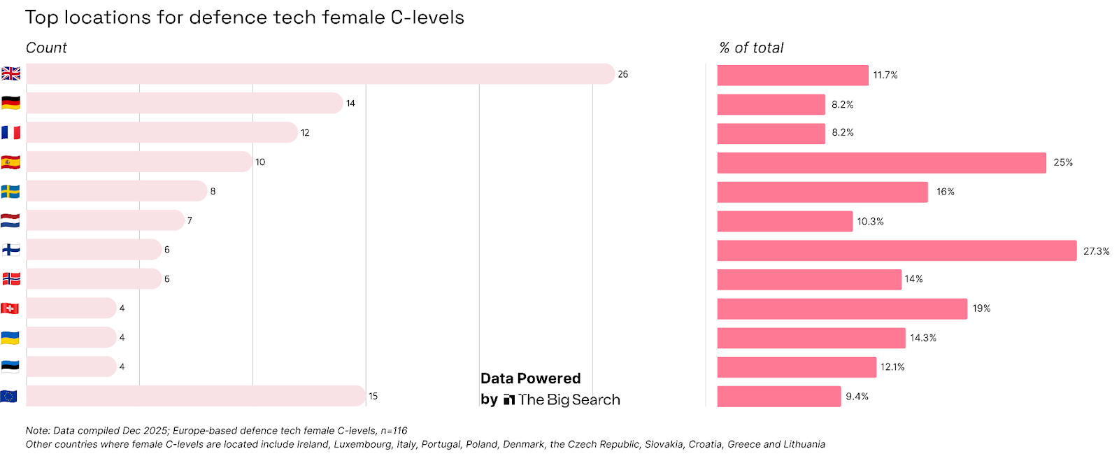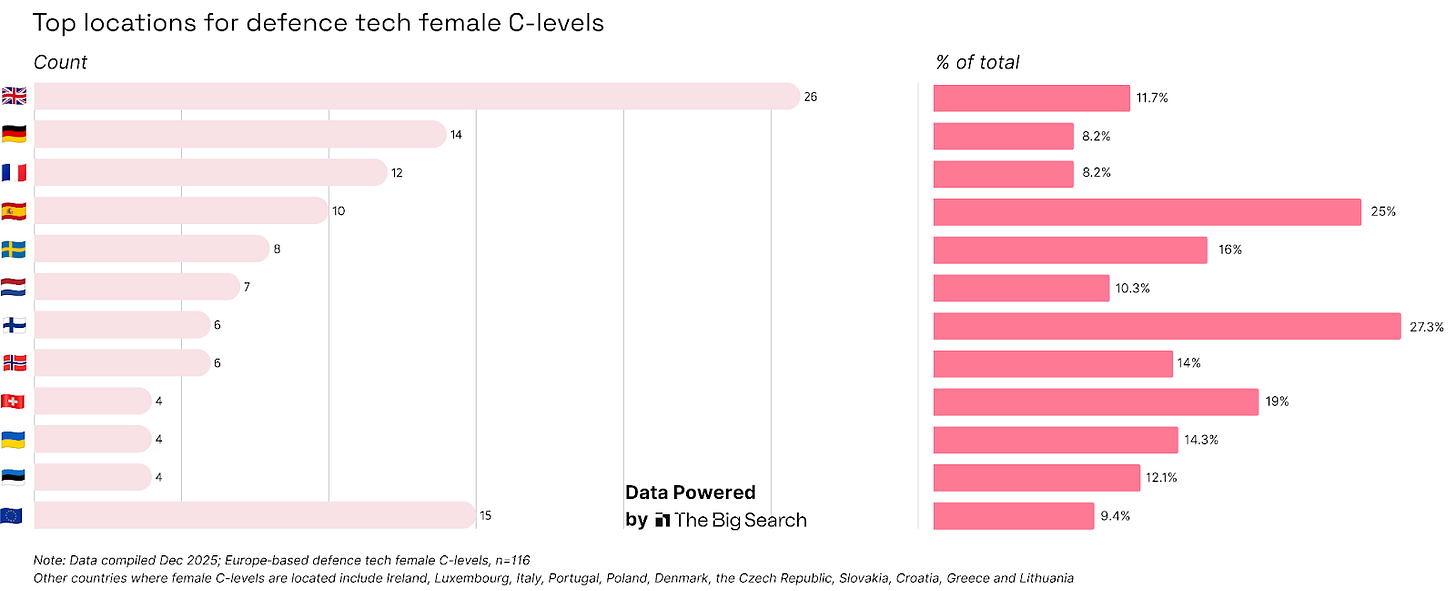 These countries dominate defence tech funding and invest a large share of their procurement money into domestic companies. With more well-funded firms, you’d naturally expect more structured C-level teams and more women at that level than in other European countries.