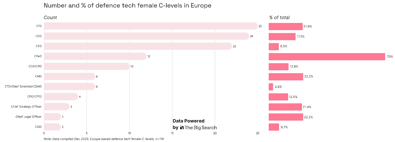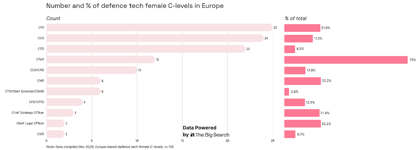 Across defence tech, women at C‑level mostly work in finance and ops when you look at absolute numbers, and in people, marketing and legal when you consider percentages.