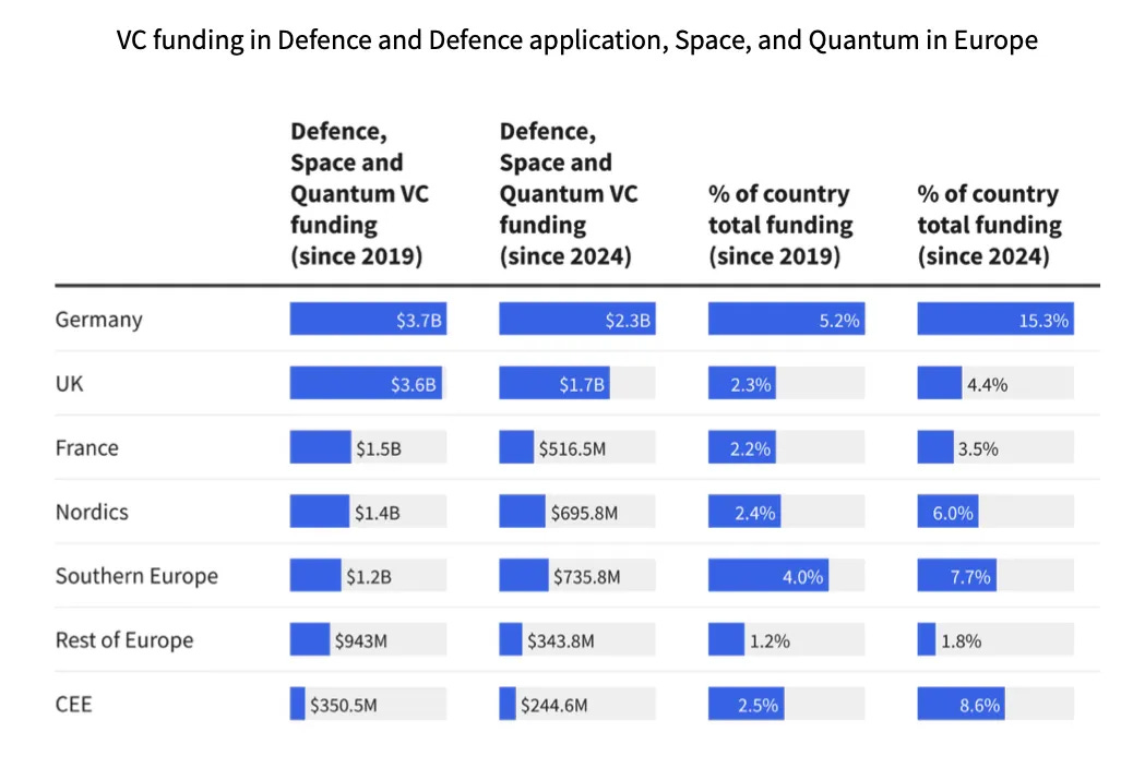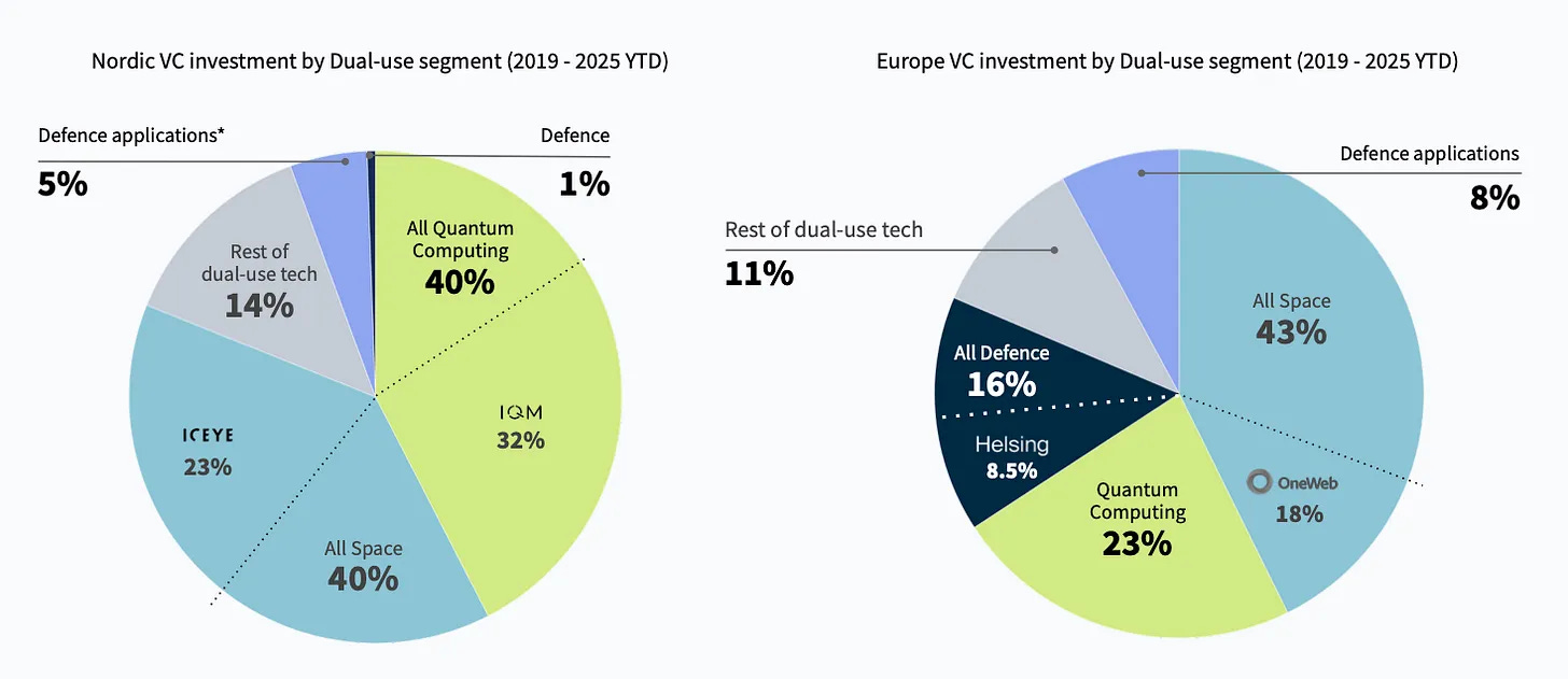 Look a little closer and a different story appears. Most of that private money is not going into what generals are actually asking for. Around 80 percent of VC funding since 2019 has gone into space and quantum, with only a thin slice going into core defence systems. The charts show the Nordics spending about 40 percent of dual-use VC on space and another 40 percent on quantum, while pure defence gets around 6 percent when you count defence and defence applications. Europe as a whole spends a much larger share on core defence technology such as weapons, sensors, and command systems.