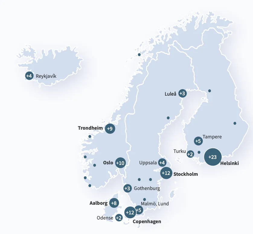 Per capita, the region looks strong. The Nordics now lead Europe on defence and dual-use VC per head, with Finland way out in front. Finland and Denmark also sit at the top of the European tables for quantum investment, and Finland has turned itself into a serious space player, with major rounds for firms such as ICEYE and IQM. The geographic spread is also telling. Helsinki, Stockholm, Copenhagen, Aalborg, Trondheim, and Oslo form the main cluster, with Aalborg and Odense in Denmark showing the pull of local universities and legacy defence industry.