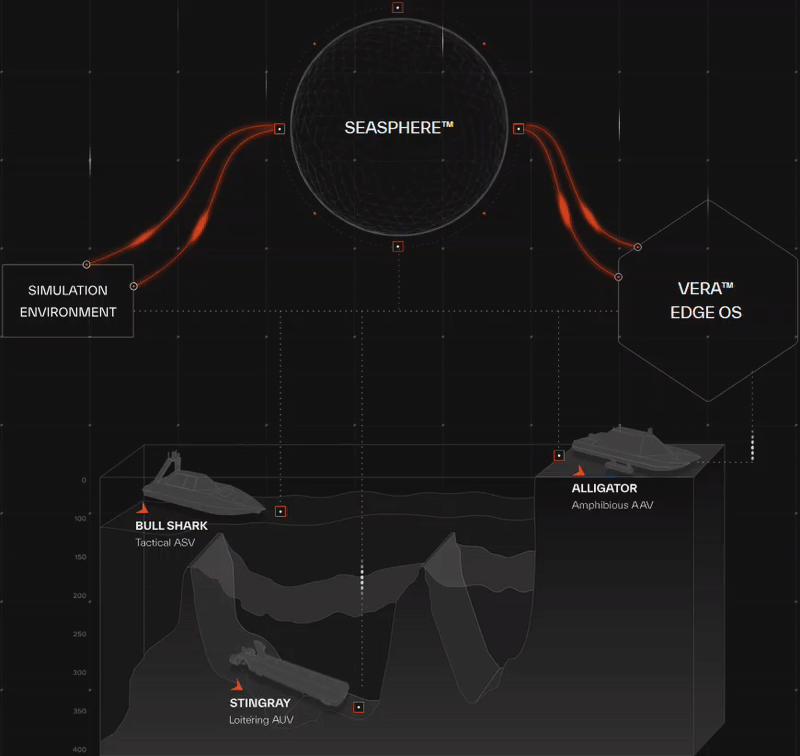 What ties it all together is the orchestration. SeaSphere sets the plan by deciding which asset should patrol, dive, scout, or carry a payload, while Vera handles the execution on each machine, adjusting to the environment. So in practice, this means a Bullshark on the surface, a Stingray below, and an Alligator at the shoreline can operate as a single system, sharing tasks and reacting to the same mission picture instead of behaving like three disconnected drones.