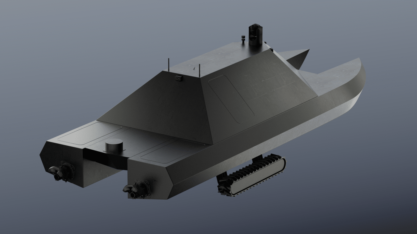 Conceptually, that makes it an amphibious utility vehicle for hauling supplies, supporting underwater drones, and handling security tasks in the messy zone where land and sea overlap.