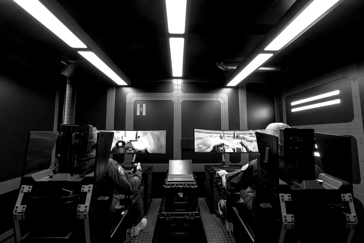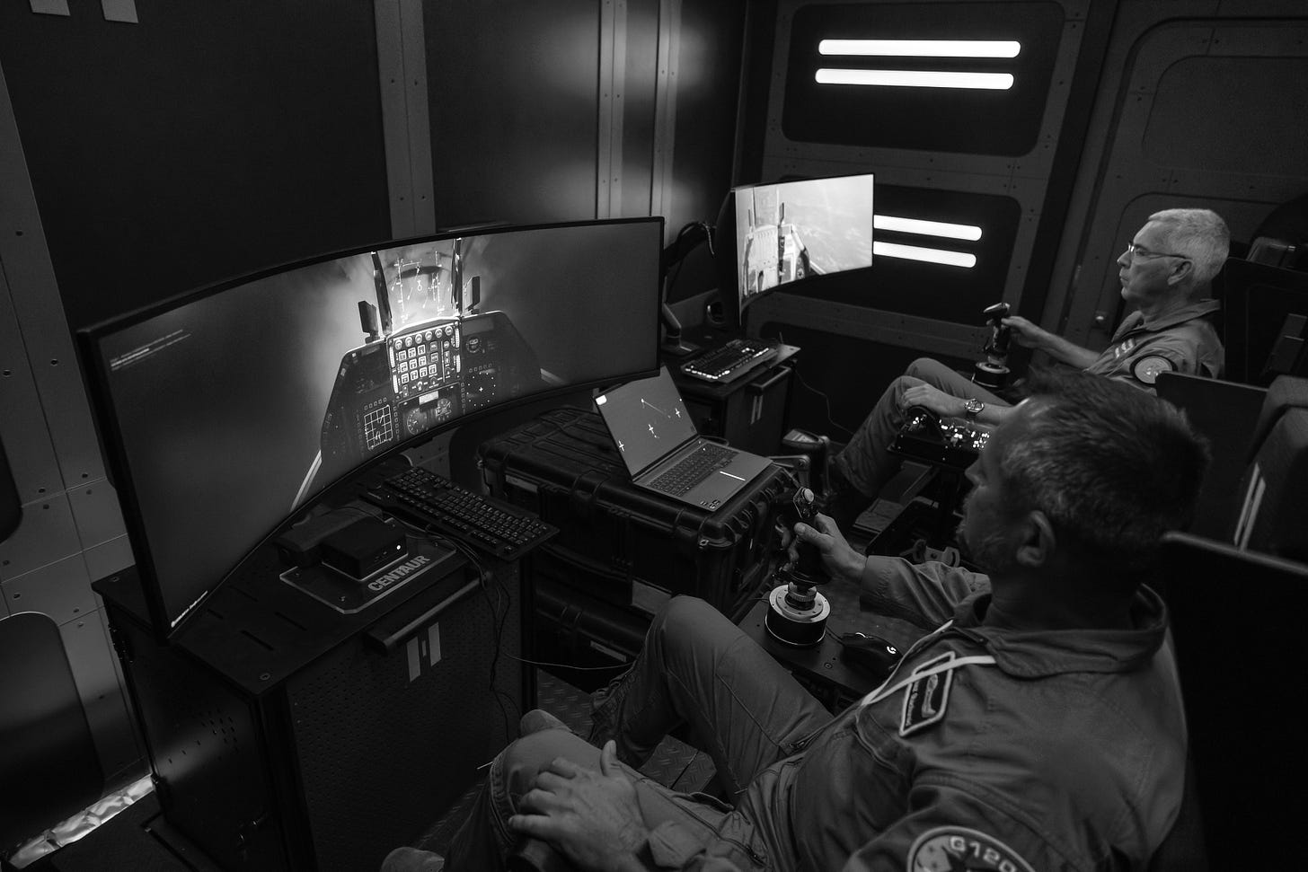 The air domain room was equally striking, with internal doors that slid apart to reveal two retired fighter pilots in fatigues sitting at flight simulators. We then watched on a large screen as two AI piloted fighter jets engaged them in a dogfight. When the AI jet hit the human piloted jet, the screen on one of the simulators showed the plane in a tailspin with flames and smoke in front of the pilot, a stark reminder of what is at stake here.
