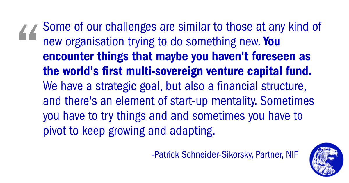 Some of our challenges are similar to those at any kind of new organisation trying to do something new. You encounter things that maybe you haven't foreseen as the world’s first multi-sovereign venture capital fund. We have a strategic goal, but also a financial structure, and there's an element of start-up mentality. Sometimes you have to try things and and sometimes you have to pivot to keep growing and adapting.