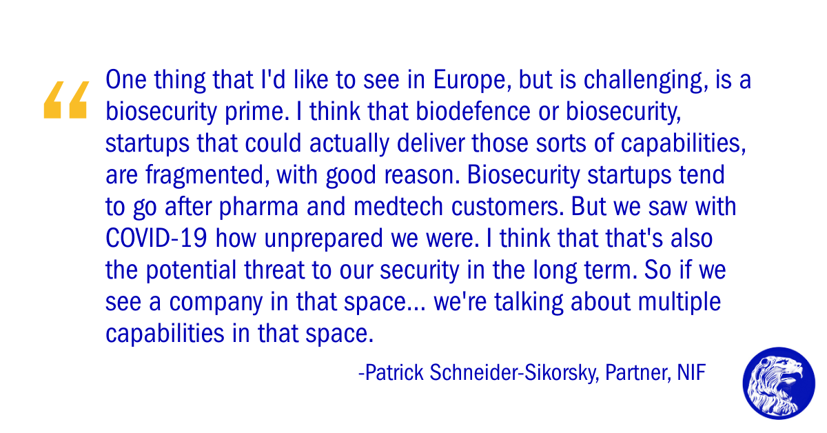 One thing that I'd like to see in Europe, but is challenging, is a biosecurity prime. I think that biodefence or biosecurity, startups that could actually deliver those sorts of capabilities, are fragmented, with good reason. Biosecurity startups tend to go after pharma and medtech customers. But we saw with COVID-19 how unprepared we were. I think that that's also the potential threat to our security in the long term. So if we see a company in that space… we're talking about multiple capabilities in that space.